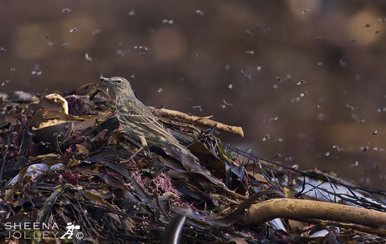 Beach Picnic (featured left) reached the final round. The Aran Islands are an oblique line of three inhabited islands of solid rock forming a broken continuation of the limestone pavements of the Burren and guarding the entrance to Galway Bay. Nature has made few locations wilder. The islands with their rich fishing waters, beaches,cliffs, lakes and streams are home to a whole range of bird life. The Rock Pipit ( Anthus spinoletta) occupies a coastal habitat especially on rocky shores of the islands This shot was taken at Corruch on a stoney northern shore of Inishmore , the largest of the Aran Islands on a rare, warm, sunny day on 10th March, 2009 at 13.13hours. I had spent the morning observing and photographing the Grey Seals. The bird life was numerous and varied both on and above the shore line. However, as the day became warmer, my attention was drawn to the smallest bird feasting on the now abundant insect activity on the seaweed at the high tide line. It would have been easy to miss the frenzied activity of the Rock Pipit as she was so well camouflaged against the seaweed but by getting low to the ground I could capture the scene. I had to shoot at a fast shutter speed to freeze the flight of the flies and catch the moment the Rock Pipit had snatched one from the air.
