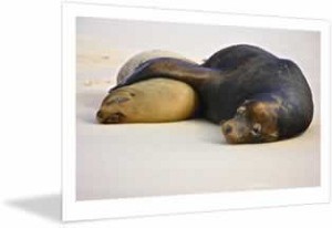 Christening (Seal Safe)Ideal christening gift to welcome a new arrival ... The Galapagos Sea Lion spends a lot of time lounging around on sandy beaches.Normally a cow will spend the first week of their pup's life bonding with it. I took this shot in April on Hood Island when the pup must have been at least five months old. It was very touching to see this cow use her flipper, which is so important for propulsion in the water, to control and protect her pup. The Galapagos Seal Lion is categorised in the 2008 IUCN Red List of Threatened Species as Endangered.